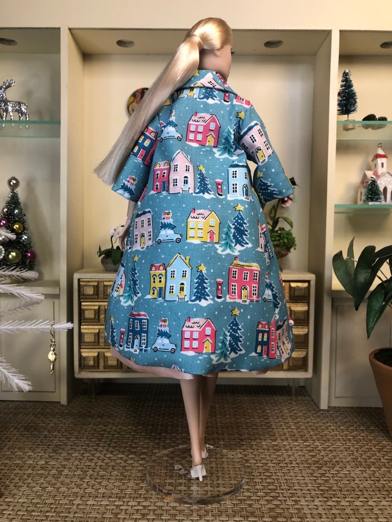 A charming print from Liberty of London’s quilting collection, depicting colorful, snowy houses decorated for the Holidays, Christmas trees, and a car, laden with gifts, pulling up outside. The classic swing coat is fully lined in aqua silk and sports pale pink glass bead buttons. The accompanying party dress is made from pale pink silk.