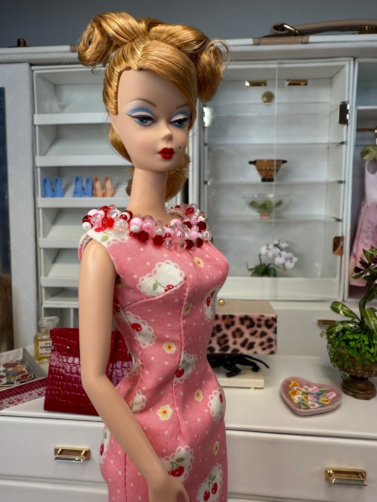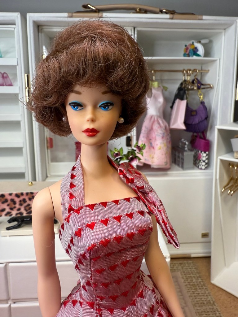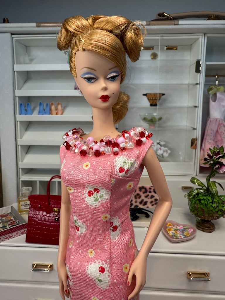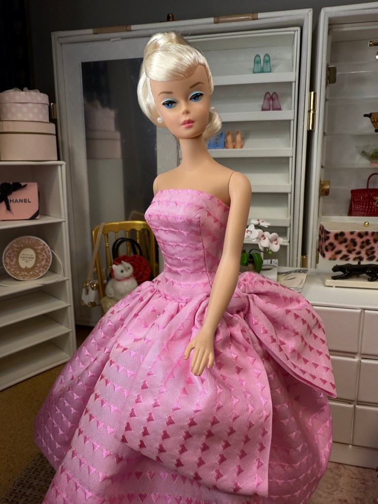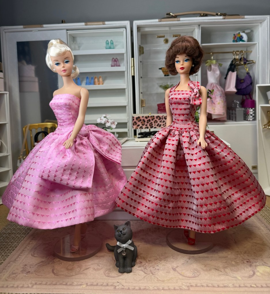 Two stunning silks woven with tiny hearts in pink on pink and red on red, just in time for Valentine’s Day. Each gown has a dropped waist bodice. The pink dress is strapless and sports a large bow on the hip. The red dress has a halter strap that ends in a lovely bow. Both dresses have tulle petticoats.