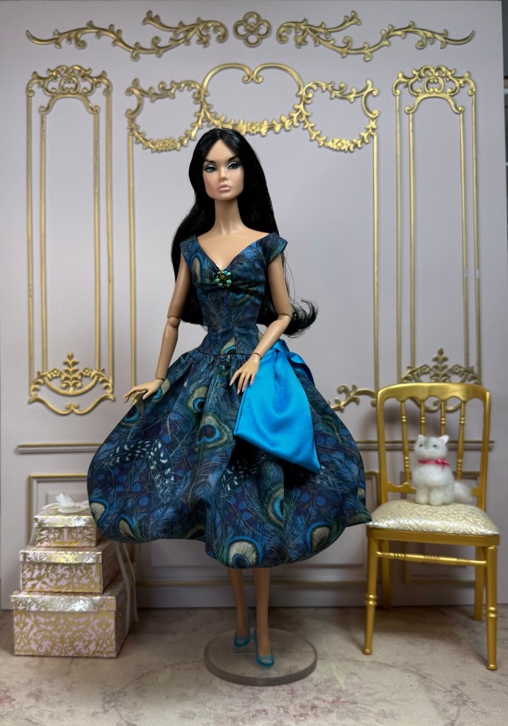 This glorious fabric called Peacock Manor is based on Liberty’s classic design Hera, and features peacock, Jay, and guinea fowl feathers, superimposed over another print of berries. The style of the dress is a bubble, featuring an off the shoulder bodice with a ruched, jeweled bust. An oversized Aegean blue silk bow decorates the hip.